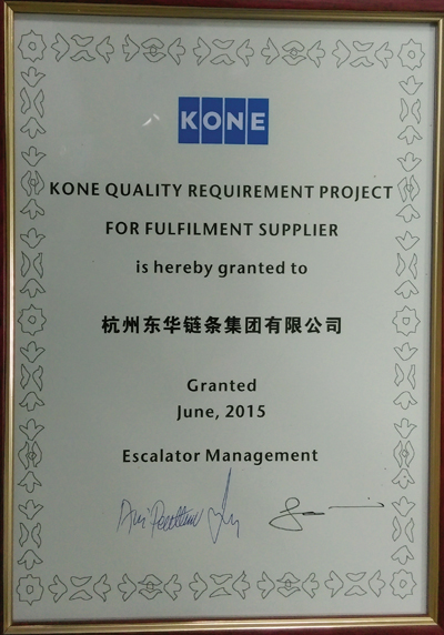6月16日,東華扶梯鏈事業部通過通力公司“最低質量要求”的審核,獲得合格質量證書。東華是通力公司全球供應鏈中獲得此榮譽的首批10家供應商之一,也是獲得此榮譽的唯一鏈條供應商,這是對東華扶梯鏈產品質量的高度認可。