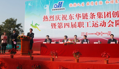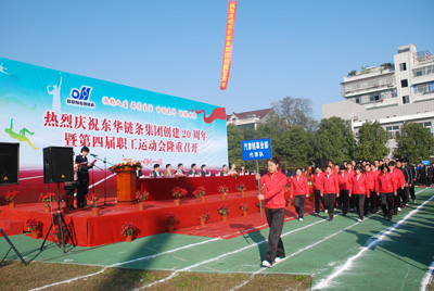 11月27日,運(yùn)河鎮(zhèn)亭址小學(xué)內(nèi)彩旗飄揚(yáng),鑼鼓喧天,雖然已是初冬,但20度的高溫和暖和的陽(yáng)光,仿佛讓人回到了春天,給在此慶祝東華集團(tuán)創(chuàng)建20周年暨第四屆職工運(yùn)動(dòng)會(huì)的東華人增添了無(wú)窮的力量和喜慶的氣氛。董事長(zhǎng)宣碧華、董事長(zhǎng)助理張世強(qiáng)、副總經(jīng)理袁立華等高層及部分員工、600余名運(yùn)動(dòng)員在此歡慶東華20華誕。