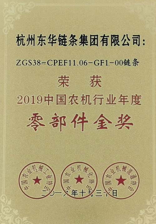 展會期間,舉行了2019中國農機行業年度頒獎典禮,東華生產的ZGS38-CPEF11.06-GF1玉米收獲機用鏈條榮獲“2019中國農機行業年度零部件金獎”,是鏈條行業唯一獲此殊榮的產品,是中國農機行業的最高榮譽。該產品具有結構新,用途巧等特點,是東華近年來研發的高端鏈條產品。