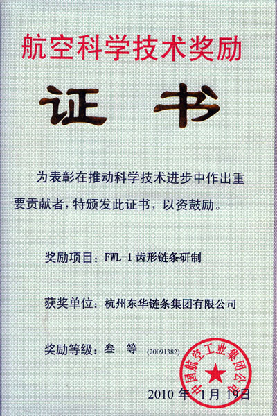 近年來,東華集團研制的FWL-1齒形鏈條產品是首款用于航空器上的鏈條產品,故要求極高的可靠性和壽命。對該產品的開發受到軍方的高度關注,分別經過了軍方的首次開發技術鑒定、首款產品樣件鑒定和量產件產品技術鑒定等三個階段,歷時三年。該航空鏈條的成功開發填補了國內航空領域用鏈條的技術空白,打破了以往該類產品長期依賴進口,被國外技術壟斷的局面,成功取代進口,為中國的國防建設做出了突出貢獻。