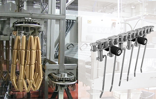 ? 食品行業(yè)主要產(chǎn)品有滾子鏈、長節(jié)距輸送鏈條、不銹鋼鏈條、各種表面特殊處理的專用鏈條等。廣泛應(yīng)用于各類食品加工機(jī)械,如肉類生產(chǎn)線、制面機(jī)械、制糖機(jī)械、紫菜加工設(shè)備、瓜子加工設(shè)備、香腸加工設(shè)備、乳業(yè)灌裝設(shè)備、冰淇淋生產(chǎn)設(shè)備等。東華根據(jù)不同的工況,采用優(yōu)化設(shè)計(jì)、特殊工藝,選用優(yōu)質(zhì)合金鋼、不銹鋼等材質(zhì),提高了鏈條的耐腐蝕、耐磨損性能,滿足各類設(shè)備的清潔生產(chǎn)、可靠使用的要求。