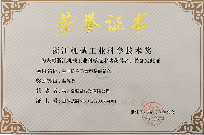 4月29日,浙江省機械工業聯合會召開會員大會,會上表彰了2020年度浙江機械工業科學技術獎。集團下屬子公司杭州自強鏈傳動公司的高端產品“單向防彎重載型梯級鏈條”榮獲三等獎。這是東華集團產品創新項目連續九年榮獲浙江機械科技獎,也是2020年度全省機械工業科技創新成果獎項中唯一的鏈傳動企業的高端產品獲獎。