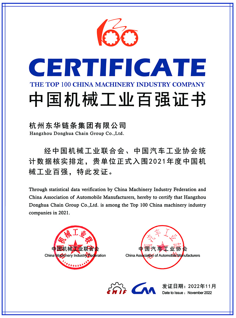 2022年,東華鏈條集團榮登中國機械工業百強榜第60位,這是東華鏈條集團連續七年榮登中國機械工業百強榜,也是中國鏈傳動行業唯一上榜企業,充分展現出企業在中國鏈傳動行業的綜合實力和龍頭地位。