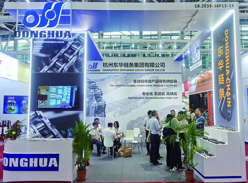 東華鏈條展廳位于展館的D區,由國際市場部、盾牌公司等聯合參展,展品有各種高端滾子鏈、輸送鏈等150余件。展會期間不斷有世界各地的新客戶來到展廳參觀詢問,近至亞洲,遠至南美和歐洲,他們詢問了解公司信息,交換名片和遞送公司宣傳冊,也有合作多年的老客戶、老朋友到東華展廳參觀交流。參展團隊向客人介紹企業的發展情況以及新產品、新技術等信息,雙方積極尋求新的合作方向。