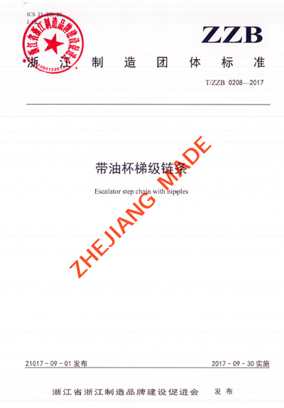 日前,浙江省浙江制造品牌建設(shè)促進(jìn)會(huì)印發(fā)“浙促會(huì)標(biāo)發(fā)[2017]43號(hào)”文件,批準(zhǔn)發(fā)布由浙江藍(lán)箭萬(wàn)幫標(biāo)準(zhǔn)技術(shù)有限公司牽頭組織制訂、杭州東華鏈條集團(tuán)有限公司負(fù)責(zé)起草(主導(dǎo)制訂)的“浙江制造”團(tuán)體標(biāo)準(zhǔn)T/ZZB 0208—2017《帶油杯梯級(jí)鏈條》。