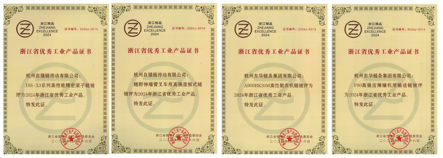 日前,浙江省優秀工業產品評選委員會發布了“2024年浙江省優秀工業產品”,東華四項高端產品榮獲“浙江省優秀工業產品”稱號。分別是“DH-X3系列高性能精密滾子鏈”、“越野伸縮臂叉車用高強度板式鏈”、“A960HK39M高性能農機鏈”、“P80高強度攤鋪機用輸送鏈”。
