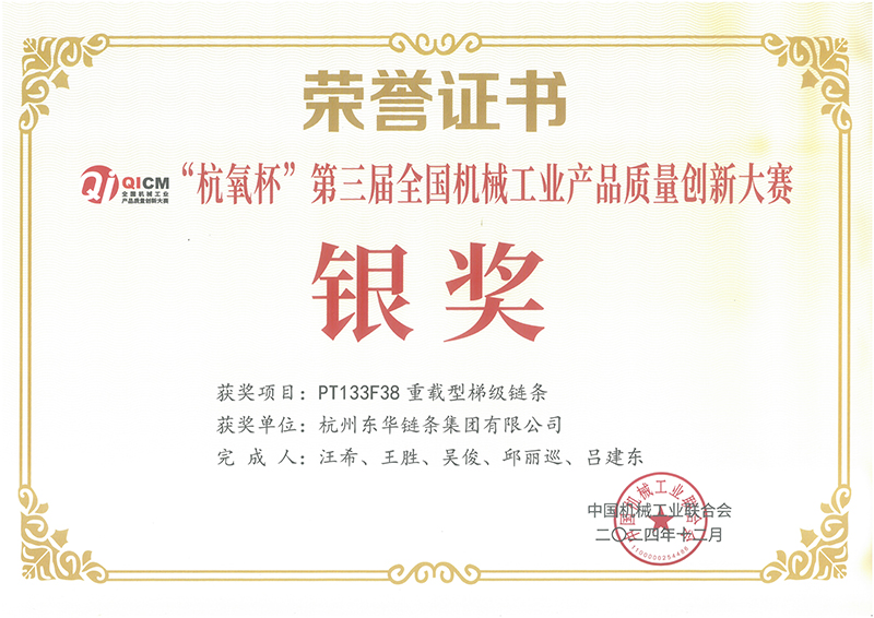會上,頒發了“杭氧杯”第三屆全國機械工業產品質量創新獎。東華榮獲兩項銀獎和一項優秀獎。銀獎分別是由扶梯工程鏈事業部選送的“PT133F38重載型梯級鏈條”項目和農機鏈事業部選送的“667X-ASF高性能農用車輸送鏈”項目,由盾牌鏈條選送的“C12B高耐磨高精度紙箱用輸送鏈”榮獲優秀獎。項目負責人上臺領獎。